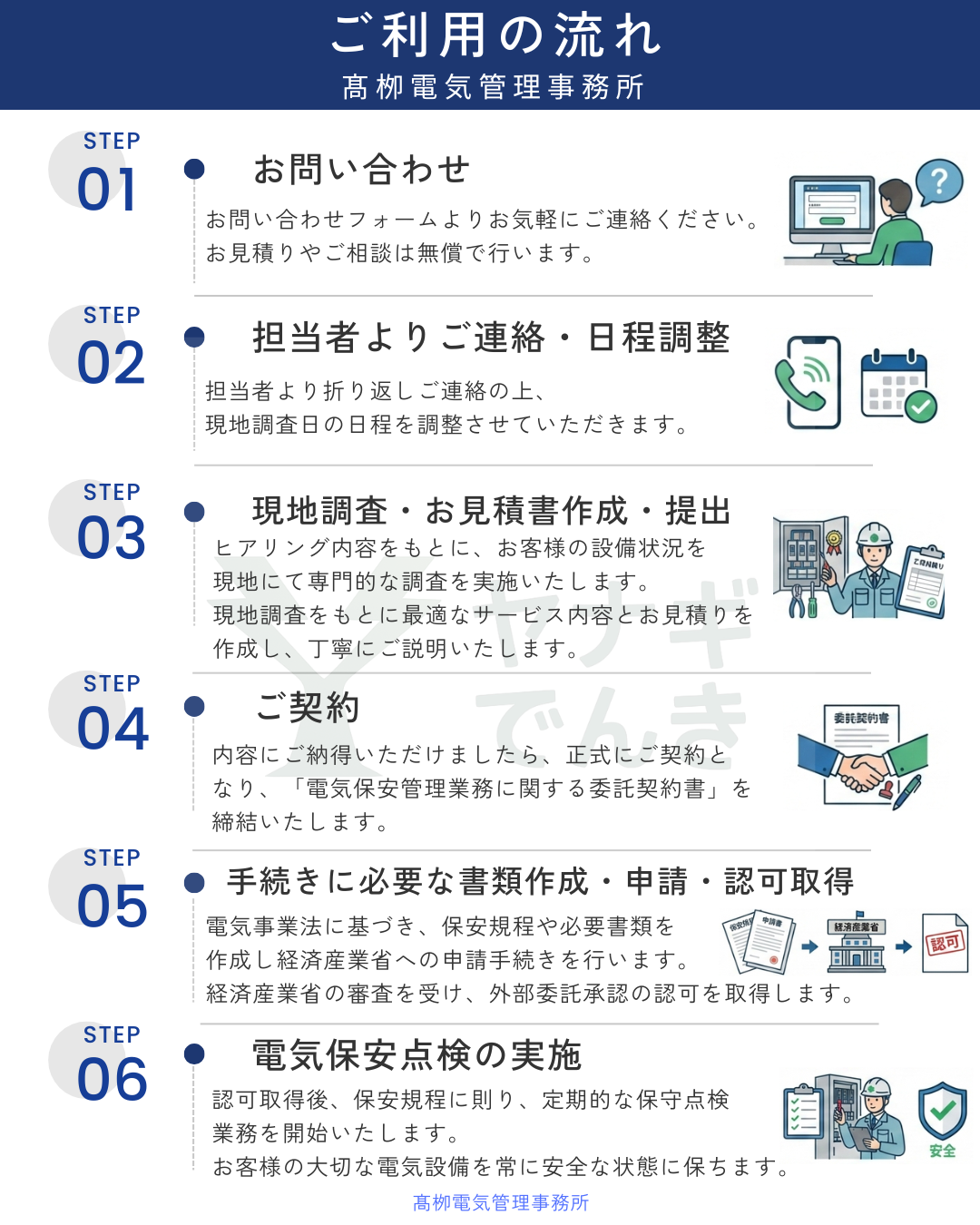 髙栁電気管理事務所へのご依頼からお客様の電気設備が安全に管理されるまでのプロセスをご案内いたします。